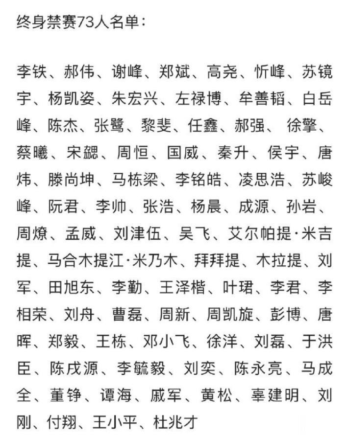 合计73人被终身禁赛,包括李铁、陈戌源、杜兆才、陈永亮、戚军、王小平等已经被判刑的人员。值得一提的是,这也是足协第二次公布禁足名单,加上第一批的话,总共136人被禁赛,其中116人终身禁足,20人禁足5年!毫无疑问,这一轮中国足坛扫黑反腐,可以说是历史上规模最大、牵扯最广,只要参与“假赌黑”,都被重罚了!
