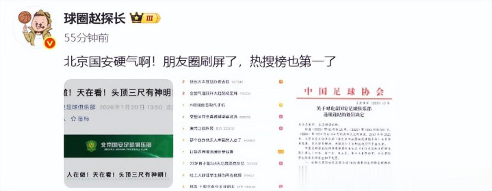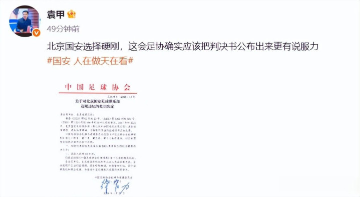 媒体人“探长”表示,北京国安硬气,都已经刷屏了,热搜榜也是第1!而记者袁甲认为,足协应该把判决书公布出来,这样更有说服力!不过,足协此前似乎还没有公布过判决书,这次应该也不会,都是按照足协官方发布的文件,来执行对球队和球员的处罚!