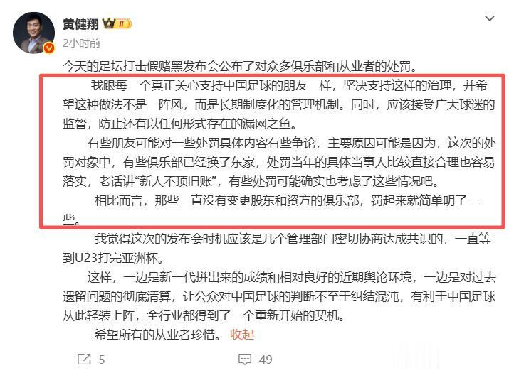 名嘴黄健翔也谈到了中国足球“假赌黑”整治行动,坚决支持,而且希望这样的做法不是一阵风,而是长期制度化的管理机制,并且应该接受球迷的监督,防止漏网之鱼!而且,对于一些处罚争议,黄健翔也进行回应,他认为主要原因是,一些处罚的对象,有些俱乐部已经换东家,处罚当年的当事人比较合理,也更加容易落实,而那些一直没有变更股东和资方的俱乐部,处罚起来就简单明了!