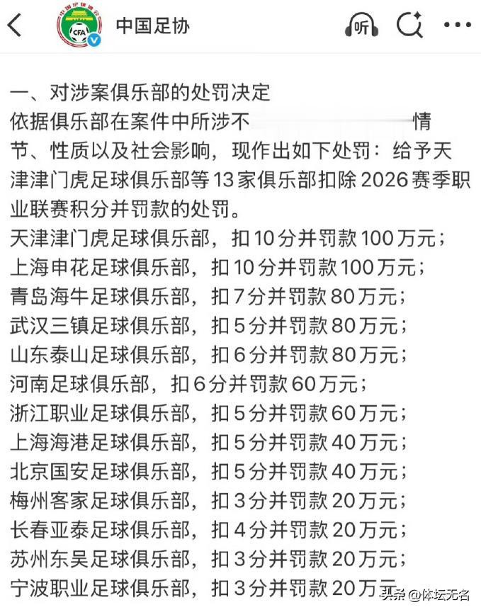 北京时间1月29日,中国足球再次成为焦点,足球行业“假赌黑”问题专项整治行动新闻发布会已经结束,涉及其中的俱乐部和球员,关于他们的处罚结果出炉!让人咋舌的是,中超联赛16支球队,其中9支被扣分和罚款,包括上海申花(-10)、天津津门虎(-10)、青岛海牛(-7)、山东泰山(-6)、河南队(-6)、北京国安(-5)、上海海港(-5)、浙江队(-5)、武汉三镇(-5)等。其他各级联赛,长春亚泰(-4)、梅州客家(-3)、苏州东吴(-3)、宁波(-3)!